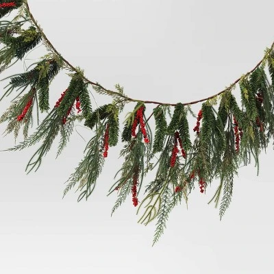 - 6ft mixed greenery and red berries artificial Christmas garland