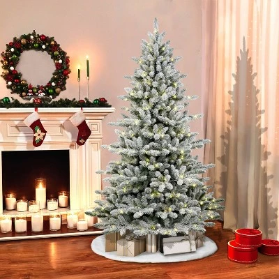 “Bring the holiday spirit into your home with the Puleo International 7.5′ Flocked Bennington Fir Artificial Christmas Tree. This pre-lit artificial tree features hinged, flocked green branches, the Sure-Lit Pole® and 400 color changing multi-function RGB LED lights with a remote control to brighten your home for a dazzling Christmas display. With life-like pine needles and a realistic appearance, this artificial tree is sure to add warmth to any room or space for years to come. The included sturdy metal base will safely and steadily support your tree and decorations. Easily connect and illuminate your tree with the Sure-Lit Pole by simply inserting the tree sections into one another. Plus, if one bulb burns out, the rest remain lit. Constructed from flame-retardant and non-allergenic materials, this tree provides a safer alternative to real trees. The Bennington Fir Tree with 400 lights measures 90″” tall x 50″” in diameter and weighs 27.5 lbs., allowing for easy placement and versatile Christmas decorating anywhere in your home.