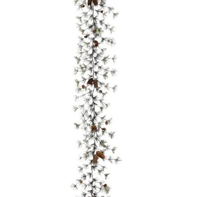 This medium- green colored traditional PVC needles give this garland a full and luxriant with some snow-like frosted branches making this garland look very realisticProduct Features:UnlitFor indoor use onlyBendable wire center allows for you to shape the garland any way you desireGreen metal hooks on each end for easy hanging Dimensions: 9′ long x 10″ wideMaterial(s): PVC/ metalNote: Branches are compressed for shipment, and need to be fluffed out upon arrival to look like the photo.