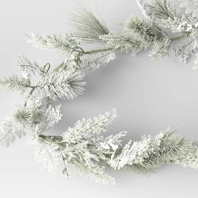 Add wintry flair to your seasonal decorations with this Artificial Garland Heavy Flocked from Threshold™. This artificial Christmas garland features a mixed foliage of flocked pine and cypress branches for a lovely snowy look. Drape the garland on a window frame, place it on a mantel or display on a wall anywhere inside your home for versatile decorative use.