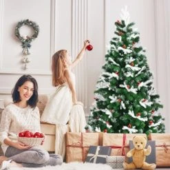 Tangkula Snow Flocked Artificial Christmas Tree Hinged Alaskan Pine Decoration Tree