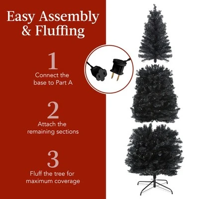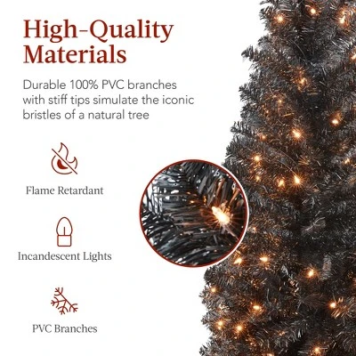 Reimagine your holiday decor with our Black Pencil Tree, meticulously designed to blend quality craftsmanship and convenience seamlessly. Crafted with sturdy metal hinges and flame-retardant PVC branches, this tree stands tall with the support of a reliable metal base, ensuring it remains a cherished part of your holiday season for years to come. Its slim, space-saving profile is a versatile addition, serving as an elegant entryway accent or a captivating centerpiece for your festive displays. Available in various heights, from 6ft to 12ft, with branch tips ranging from 608 to 1,800, this Pre-Lit Pencil Tree features warm white incandescent lights that cast a soft, enchanting glow, elevating the holiday spirit in your home. Assembly is a breeze with just three simple steps: connect the base to the largest section, attach the remaining sections, and fluff the branches for full coverage. Customize your tree with garland, lights, ornaments, tinsel, and DIY decor to accentuate different areas of your living space, office, or even a Halloween party. Embrace the possibilities and make this tree your canvas for holiday magic!