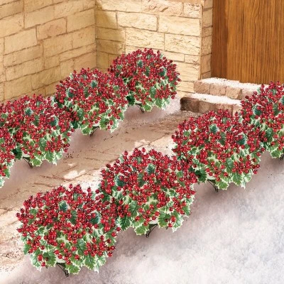 These stunning holly arrangements are a beautiful way to add holiday color indoors or outside your home. The set includes 3 bunches of holly leaves with bright red berries display them in your planters or baskets (not included), or stake them into the ground. Use them separately for smaller bouquets or all together for a beautiful arrangement (as shown). Polyfoam, polyester and plastic. 9″Dia. x 16 1/2″H. Set of 3.
