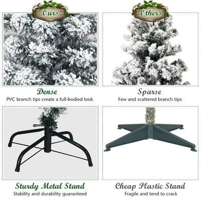 Transform your living room into a unique winter wonderland with our pre-lit snow flocked pencil Christmas tree. The tree, crafted with 242 branch tips and snow flocked leaves, is leafy and elegant. It will give you the illusion of a full-body genuine tree. 150 warm LED lights will bring a festival glow to your room. High quality PVC branch tips with exquisite craftsmanship will not fall off or fade easily, ensuring long term use. Supported by sturdy metal stand, this artificial Christmas tree will keep standing upright for years to come. At the same time, the metal stand is foldable to facilitate storage. All hinged construction makes the artificial tree easy to set up and fluff. In addition, this Xmas tree can be divided into 2 sections and placed in a storage bag for future reuse easily. With its slim pencil design and realistic appearance, this artificial Christmas tree is perfect for display in corners or small rooms. Add it to the cart and celebrate Christmas in style with our snow flocked pencil Christmas tree.