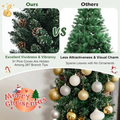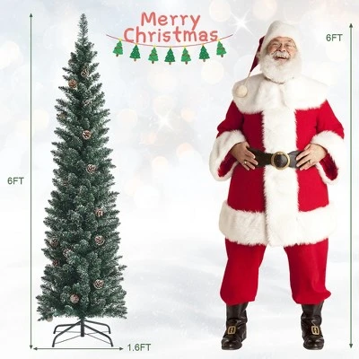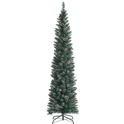 There is no better decoration than a classic Christmas tree to celebrate the coming new year. Our slim snowy realistic pine tree with 5 FT6FT7FT in height looks grand to catch people’s eyes at sight. Featured with 214267351 branch tips, the pencil Xmas tree look flourishing without taking up space. The snowy tips and pine cones enhance vividness and vibrancy to the tree. In addition, the tree needs less time and energy on fluffing and assembling, so you can spend more time on ornaments hanging. Thanks to the enhanced metal stand, the tree will stand on the floor stably and uprightly. And the folding metal base ensures effortless storage when Christmas is over. This charming realistic Christmas tree will highlight your indoor decoration and spread joyful Christmas feel.