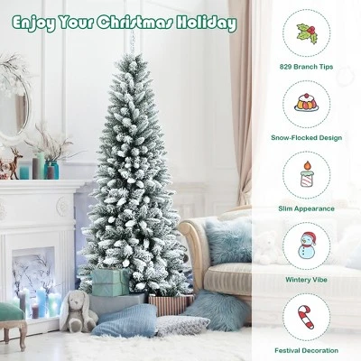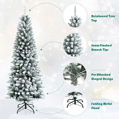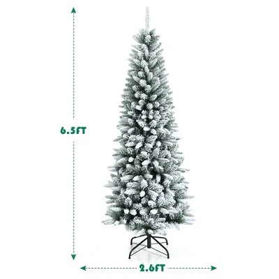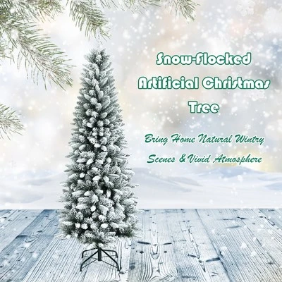A snow-flocked artificial Christmas tree create strong festive atmosphere and wintry vibe in your home. Standing at 6.5ft, this snow-flocked tree comes with 829 branch tips, which have 2 leaf shapes to create natural gradation. Plentiful snow-flocked leaves create flourishing and luxuriant appearance. And this Christmas pencil tree adopts premium PVC and PE materials, making it stand out of inferior trees. Thanks to hinged structure, it is easy to assemble together by inserting sections in order. Supported by folding metal stand, the tree ensures high stability for season long. Also, you can hang other ornaments on the branches, dressing up the tree to personalized one. Hope you have happy holiday time with family and enjoy the coming joyful Christmas.