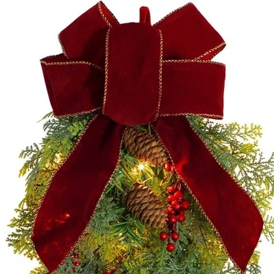 Add a beautiful Christmas swag to the back of any chair. This chairback swag features an assortment of PE/PVC lush, mixed greenery, faux berries, and real pinecones. Pre-lit with 15 warm white LED lights, this swag shines brighter than most and has a countdown timer function that runs 6 hours on and 18 hours off. The PE/PVC mixed greenery (45% PVC/ 10% PE) blend features 31 tips and comes with a velvet-covered hook for easy hanging on either the back of a chair or staircase railing. A beautiful weather-safe red velvet bow is the finishing touch to this Chairback Swag. Requires 3 AA batteries – not included. Perfect for indoor and outdoor use, Measures 14 inches Wide x 4 inches Deep x 20 inches High and Weighs 1 pound.