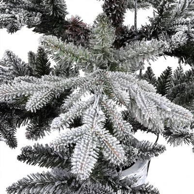 The artificial PE/PVC Flocked Timberland Fir Potted Christmas tree brings Nordic charm to your home during the holiday season. The Timberland Fir Christmas Tree features 494 PE/PVC artificial greenery tips and flocked with faux snow. Pre-lit flocked branches are spaced to allow you to display your precious and memorable ornaments. The tree is also pre-lit with 150 warm white LED low voltage lights that create a beautiful glow against the flocking on the branches. A polyresin base look like real white birch tree bark! UL listed adapter. Flame-retardant PE/PVC. Cord length is 71 inches long. Suitable for indoor use. Measures 36-inch Diameter x 60 inches High; Polyresin base measures 9 inches Long x 9 inches Deep x 9 inches High, Total weight is 14.3 pounds.