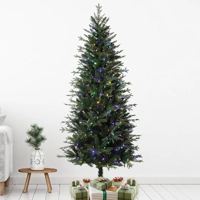 Let the colors shine with the artificial prelit 6. 5-foot Asheville Fir tree. It has 1486 tips with 350 color changing LED lights, featuring 3 functions – clear, multicolor or alternating clear and multicolor. This tree will be the hit of your holiday season as the light colors change and twinkle. The realistic branches are constructed from PVC and PE and are on hinges for easy setup. It comes with a foldable metal stand and convenient foot pedal control for easy on/off functionality.