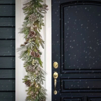 - This festive garland is pre-strung with 100 warm white energy-efficient and long lasting LED lights that can be operated with an included timer and trimmed with pinecones, berries, snowflakes, and ornaments.