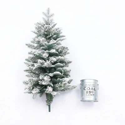 To create a festive environment this season, decorate your home, office, or special event with this sweet 3-foot artificial tree. Crafted from a combination of quality PVC and PE branches, this holiday decoration is made to bring Christmas cheer for years to come. Designed and decorated to feel lifelike and realistic, the lush artificial fir tree is flocked to give a snowy appearance. In addition, it has the added convenience of pre-strung lights. The pre-strung lights are powered by 4 AA batteries (not included) and have a convenient 6-hour timer. The artificial fir tree is featured in a rustic silver farmhouse-style round metal pot that complements the natural beauty of the faux tree. The tree also makes a beautiful and creative gift for that special person this holiday!.