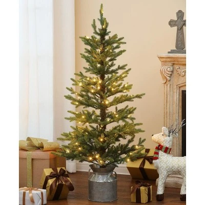 To create a festive environment this season, decorate your home, office, or special event with this sweet 4ft artificial tree. Crafted using a combination of quality PVC and PE branches, this holiday decoration is made to bring Christmas cheer for years to come. Designed and decorated to feel lifelike and realistic, the lush artificial fir tree has fluffy green tip branches and has the additional convenience of pre-strung lights. No worrying about cleaning up after this tree or untangling lights! Family and guests will marvel at the transformation of your home into a beautiful winter wonderland capturing the beauty and charm of the holidays. This artificial fir tree is featured in a rustic farmhouse style milk can pot that is visually appealing and complements the natural beauty of the faux tree. The tree also makes a wonderful and creative gift for that special person this holiday season!.