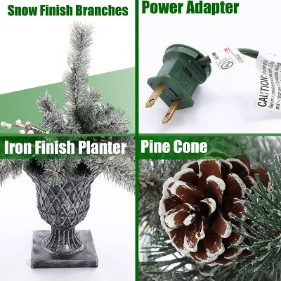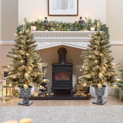 Frame your entrance, mantle or dining room with the beautiful set of 2 4-foot faux Christmas tree. Whether for your home, office, classroom, or special event this set is sure to be a staple in your holiday decorations. Easy to assemble and crafted from quality PVC green needles and adorned with pine cones and white berries, this artificial tree has an authentic realistic style that will look great decorated or as-is. Pre-strung with warm clear LED lights, the tree is truly hassle free and the sparkling lights make any corner feel festive. Each tree includes a stylish urn pot in a graceful gray finish. This set is so visually appealing and welcoming that you may want to make a permanent part of your decor. Enjoy the season twice as much with this stunning and dazzling set..