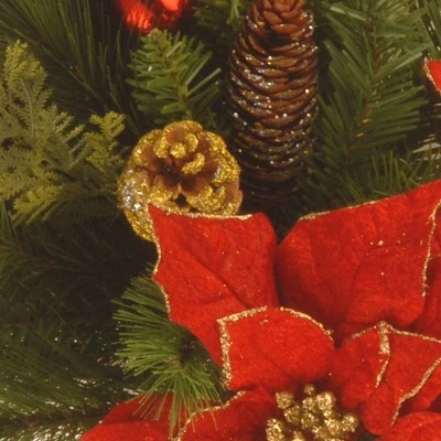 - LASTING DURABILITY: Built to endure many holidays, this decoration piece is trimmed with ball ornaments, pine cones and red poinsettia flower. Our time-tested needles are fire resistant and non-allergenic.