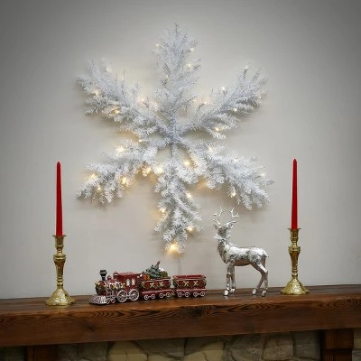 This tinsel snowflake will add a sparkling accent to your decorating scheme. It is pre-strung with 35 battery-operated warm white LED lights that are energy-efficient and long lasting. 6 hours ON/18 hours OFF timed operation. This snowflake decoration can be displayed on doors, walls and windows in indoor or covered outdoor locations.