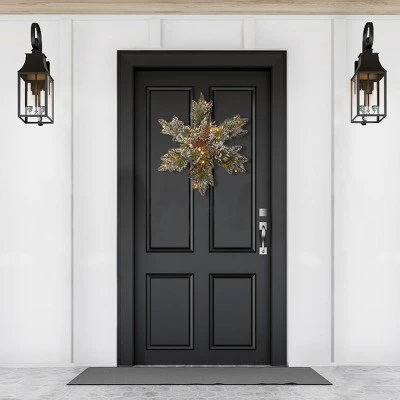- Designed with a Glittery Bristle Pine branch base, this pre-lit artificial Christmas hanging snowflake is 18 inches long and decorated with pine cones and frosted branches.