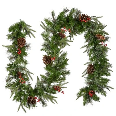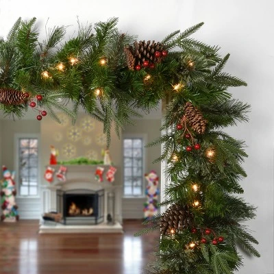 - Designed with a Colonial Fir branch base, this pre-lit artificial christmas garland is 9 feet long and decorated with pine cones.
