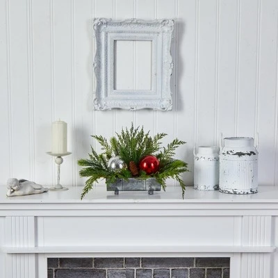 Set the scene during the holidays with this Cedar Pine, Pinecones, and Ornaments Artificial Christmas Arrangement. Handcrafted by stylists and inspired by nature, realistic-looking cedar is accented by pinecones and glossy ornaments for a bit of holiday cheer. With a length of 18in. and housed in a tin vase, house in any table that needs a Christmas touch. House in a mantel, dinner table or foyer. Artificial arrangements are manufactured using synthetic materials, such as polyester material or plastic, and are well designed and constructed to be life-like in appearance. This item will need to be re-shaped when removed from the secure box to allow it to reach its fullest size. Your arrangement will look beautiful for years to come; simply wipe clean with a soft dry cloth when needed.