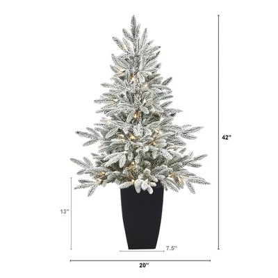 If you’re dreaming of a white Christmas, look no further, this flocked Manchester Spruce Artificial Christmas Tree makes your wish come true. Designed to mimic real evergreen foliage and texture, this mini artificial Christmas tree features 133 easy-to-bend branches – allowing you to decorate with your mini ornaments. Pre-strung, with 50 lights, for a cozy feel – save time and money. Standing at 3.5’ from a metal planter (height includes planter), make a Christmas statement, wherever you curate. Its compact size makes it perfect for kids’ rooms, foyers, apartments, and dorms. Silk Christmas Trees are manufactured using synthetic materials, such as polyester material or plastic, and are well designed and constructed to be life-like in appearance. This item will need to be re-shaped when removed from the secure box to allow it to reach its fullest size. Your artificial Christmas Tree will look beautiful for years to come; simply wipe clean with a soft dry cloth when needed.