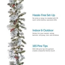 Bring the wonder of the holiday season to your home with the NOMA Snow Dusted Berry 9-Foot Artificial Christmas Garland. With realistic foliage and bright lights, this holiday garland brightens the room and brings in the holiday cheer.Place this Christmas holiday decoration inside or outside your home, year after year. Each strand of artificial garland measures 9 feet long. With 162 PE and PVC snow-dusted pine needles of various greens and varying depths, this holiday garland features a charmingly realistic look. Mini life-like berries and pinecones decorate the space between the needles. This pre-lit Christmas garland also features 35 bright warm white LED lights that give the holiday decoration a cheerful glow. The holiday garland with warm white lights is battery-powered for convenience, so there’s no power cord to worry about.With its easy-to-use battery-operated design, this artificial Christmas garland is easy to hang and display indoors and outdoors. Enjoy the holiday cheer with the NOMA Snow Dusted Berry LED Artificial Christmas Garland.