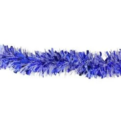 Nothing says holiday like a good old fashioned tinsel garland! This unique garland will add sparkle and shine to your holiday decor. Perfect to decorate trees, mantles and railings.Product Features:Blue tinsel garland Unlit Accented with snowblush strandsSnowblush is clear strands with white spots creating a snow like look Wide cut designFlame retardant Tarnish resistant For indoor use or covered outdoor useDimensions: 12′ long x 3″ wideMaterial(s): tinsel