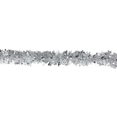 Nothing says holiday like a good old fashioned tinsel garland! This unique garland will add sparkle and shine to your holiday decor. Perfect to decorate trees, mantles and railings.Product Features:Silver tinsel garland Unlit Accented with snowblush strandsSnowblush is clear strands with white spots creating a snow like look Wide cut designFlame retardant Tarnish resistant For indoor use or covered outdoor useDimensions: 12′ long x 3″ wideMaterial(s): tinsel