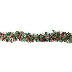Nothing says holiday like a good old fashioned tinsel garland! Green and red wide-cut tinsel combine with thin cut silver tinsel to make a full and dimensional decorating piece. Perfect to decorate trees, mantles, and railings.Product Features:Features unlit tinsel embellished garlandGarland is flame retardant and tarnish resistantAccented with thin cut tinsel for depth8 ply garland Recommended for indoor decorative use onlyDimensions: 12′ long x 4″ wide Material(s): tinsel