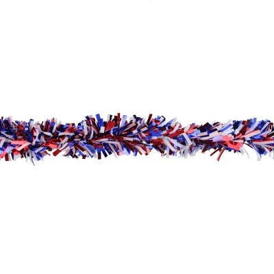 Add a patriotic touch to your holiday and Fourth of July decor! This red, white and blue garland will add shine and pops of color to your holiday decor. Perfect to decorate trees, mantles and railings.Product Features:Red, white and blue holiday tinsel garlandWide cut designUnlit Flame retardant Tarnish resistant 8 ply garland For indoor use, or covered outdoor useDimensions: 12′ long x 4″ wide Material(s): tinsel