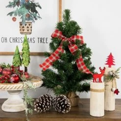 Get ready to spread some holiday cheer with this charming potted mini artifical holiday tree. Features a mix of two-tone green pine needles that mimic the beauty of a natural pine tree. This mini pine tree is perfect for small spaces such as tabletops, mantels, or even as a decoration for your office desk. Don’t let limited space hold you back from decorating for the most wonderful time of the year – bring the magic of the season into your home with this adorable artificial holiday tree.Product Features:Unlit52 tips2″ wide tipsMedium profile treeBendable wire branches for easy positioningFor indoor use onlyNo assembly required – tree comes in 1 pieceComes in a weighted burlap covered potTree cannot be removed from the rustic burlap baseDimensions: 18″ high (including the base)Distance from floor to the first row of branches: 5″11″ base diameter (at the widest point)Material(s): PVC/metal/burlapNote: Branches are compressed for shipment, and need to be fluffed out upon arrival to look like the photo.