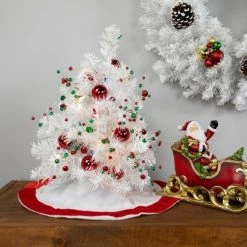 Add a touch of wintry magic to your holiday decor with pre-lit artificial holiday tree. This charming tree is the perfect size to add some festive cheer to your desk, tabletop, or mantel. With its snowy white branches and multi-colored lights, this tree is sure to brighten up any space. Whether you’re looking for a unique centerpiece or a fun addition to your holiday decorations, this snow white holiday tree is sure to delight all who see it.Product Features:Pre-lit with 30 multi-color lightsMulti-color consists of pink, purple, red, green, blue and orange bulbsBulb size: mini65 tips2″ wide tapered tips36″ white lead cordAdditional Product Features:Medium profile treeLight sets on tree are UL certified and approved for indoor or outdoor use, however, the tree itself is recommended for indoor use onlyIf one bulb burns out, the rest will stay lit2-piece easy assembly (including stand)Comes with replacement bulbsComes with a FREE plastic tree standFor indoor use onlyComes with replacement bulbsWire gauge: 22120 volts, 60 hertz, .12 amps, 14.4 watts Dimensions: 18″ high (from the base of the stand to the top of the tree)Distance from floor to the first row of branches: 3″11″ base diameter (at the widest point)Material(s): PVC/metal/plastic bulbs/wireNote: Branches are compressed for shipment, and need to be fluffed out upon arrival to look like the photo.
