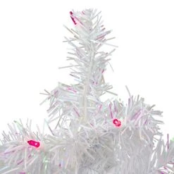 This mini pine tree features a mixture of white pine and shimmering iridescent tinsel needles The perfect tree to create the perfect winter wonderland effect. Small enough for offices and dorm rooms.Product Features:Pre-lit with 35 pink lights Bulb size: mini 64 tips 2″ wide tips 32” white lead cord Additional Product Features: Bendable wire branchesLight sets on tree are UL listed for indoor or outdoor use, however the tree itself is recommended for indoor use If one bulb burns out, the rest will stay lit Lights are equipped with Lamp Lock feature, which makes them replaceable, interchangeable and keeps them from falling out Comes with replacement bulbs and spare fuses Comes with FREE plastic white tree stand 120 volts, 60 hertz, .12amps, 14.4 watts Dimensions: 2′ high (from the base of stand to the top of the tree 16″ base diameter (at the widest point) Material(s): PVC/plastic/metal/bulbs/wireNote: Branches are compressed for shipment, and need to be fluffed out upon arrival to look like the photo.