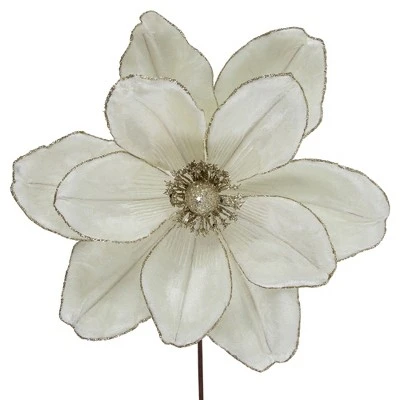Elevate your holiday decor with this magnolia holiday stem. This floral accent combines the timeless elegance of magnolia blooms with a touch of holiday sparkle, thanks to delicate glitter accents. Whether used in a wreath, centerpiece, or as a standalone decoration, this enchanting stem adds a touch of seasonal magic to your home. Product Features:Cream and gold magnolia holiday stemEmbellished with glitter Bendable wire in the petals and stemDouble wrapped wire stem for stabilityFor indoor use onlyDimensions: 24″ high x 7″ diameterMaterial(s): polyester/wire/plastic/foam