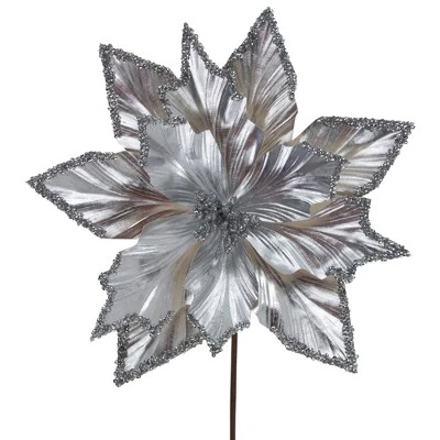 Bring a touch of elegance to your holiday decor with this stunning poinsettia holiday stem. This beautiful stem features sequined petal edges, and a silver glitter accents. Whether used as part of a larger arrangement or on its own, this stem is sure to make your holiday season shimmer and shine.Product Features:Glittered poinsettia holiday stemEmbellished with glitter and sequinsBendable wire in the petals and stemDouble wrapped wire stem for stabilityFor indoor use onlyDimensions: 24″ high x 12″ diameterMaterial(s): polyester/wire/plastic