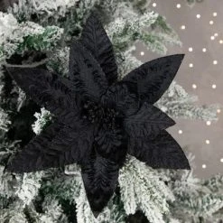 Enhance your holiday decor with this stunning poinsettia holiday stem. This stem features glittered petal edges that catch the light beautifully, creating a mesmerizing shimmering effect. The textured leaves will add depth and dimension. Use it to decorate your holiday tree, wreath, garland, or centerpiece, and let it add a touch of glamour and sophistication to your holiday display. With its unique black color and exquisite design, this holiday stem is sure to make a statement and impress your guests.Product Features:Glittered poinsettia holiday stem Embellished with glitter accentsBendable wire in the petals and stemDouble wrapped wire stem for stabilityFor indoor use onlyDimensions: 25″ high x 11″ diameterMaterial(s): polyester/wire/plastic