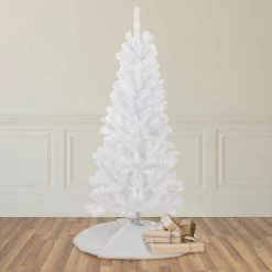 Transform your space into a winter wonderland with this beautiful White Georgian Pine tree. It is a designer-inspired alternative to a traditional green tree with its dazzling, shiny white pine needles. The lush needles give the tree fullness, but the pencil profile makes it ideal for small spaces and allows it to fit perfectly in corners.Product Features: Unlit217 branch tips1.5″-2″ wide tipsHinged branch construction (bottom piece only)3-piece easy assembly (including the stand) For indoor use only Pencil profile treeComes with a FREE white metal stand UL certified and approved for indoor use onlyDimensions: 4.5′ high (from the bottom of the base to the top of the tree)Distance from floor to the first row of branches: 9″24″ base diameter (at the widest point)Material(s): PVC/metalNote: Branches are compressed for shipment, and need to be fluffed out upon arrival to look like the photo.