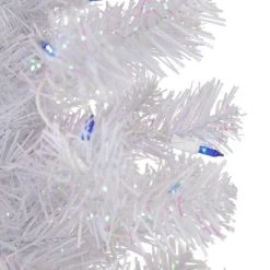 With its immaculate color and generous profile, the Rockport White Pine holiday tree glistens with wintry beauty. It is a designer-inspired alternative to a traditional green tree with its dazzling white pine needles. The branches contain a mix of matte white and clear iridescent needles that create texture and add depth to the tree. The iridescent needles beautifully reflect the soft glow from the blue incandescent mini lights. This tree is perfect for a quick and easy setup and ideal for corners or tabletops. Product Features:Pre-lit with 70 blue lightsBulb size: miniBulb type: incandescent110 tips2″ wide branch tips30″ white lead cordSlim profile treeAdditional Product Features:If one bulb burns out, the rest will stay litLight sets on tree are UL listed for indoor or outdoor use, however, the tree itself is recommended for indoor use only Lights are equipped with Lamp Lock feature, which makes them replaceable, interchangeable and keep them from falling outContains 1 plug with end connector Connector allows to stack multiple lighted items together (not to exceed 210 watts)3-piece easy assembly (including stand)Includes a white plastic tree standWire gauge: 22120 volts, 60 hertz, .24amps, 28.8 watts Dimensions: 4′ high (from the base of the stand to the top of the tree)Distance from floor to the first row of branches: 7″24″ base diameter (at the widest point)Material(s): PVC/plastic/glass bulbs/wireNote: Branches are compressed for shipment, and need to be fluffed out upon arrival to look like the photo.