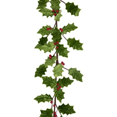 Featuring green velvet holly leaves and vibrant red berries, this garland is embellished with glitter for an extra sparkle that will catch the light beautifully. It can be hung on a mantel, wrapped around a banister, or used as a festive centerpiece for your holiday table. The glittered holly leaves add a touch of sparkle and shine to any room and can help create a cozy and inviting atmosphere during the holiday season.Product Features:Glittered holly and berry garlandFeatures green velvet leaves trimmed with green glitterAccented with red berriesIncludes a brown bendable wire stemFor indoor use onlyDimensions: 43″ long x 9″ wideMaterial(s): velvet/paper/wire/glitter