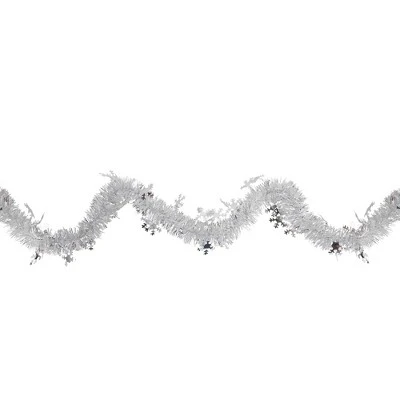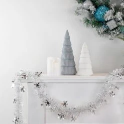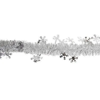 Nothing says holiday like a good old-fashioned tinsel garland! This white and silver garland is accented with silver snowflakes and will add shine and sparkle to any holiday decor. Perfect to decorate trees, mantles, and railings.Product Features:Designed with thin white and shiny silver strandsSilver snowflakes accents throughoutUnlit Flame retardant Tarnish resistant For indoor use or covered outdoor useDimensions: 50′ long x 2″ wideMaterial(s): tinsel
