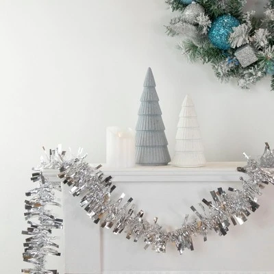 Nothing says holiday like a good old-fashioned tinsel garland! Now add a unique touch to a traditional style with this wide cut tinsel garland. This soft, plush garland will add pops of color and dimension to your holiday decor. Perfect to decorate trees, mantles, and railings.Product Features:Shiny silver holiday tinsel garlandUnlit Wide cut designFlame retardant Tarnish resistant For indoor use or covered outdoor useDimensions: 50′ long x 3″ wideMaterial(s): tinsel