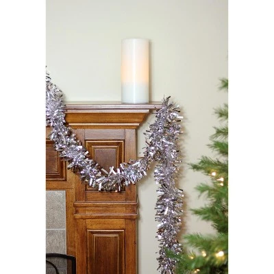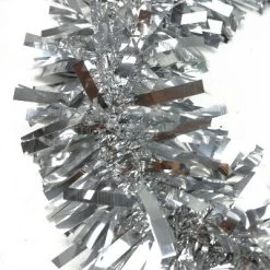 Nothing says holiday like a good old fashioned tinsel garland! This soft, plush garland will add color and dimension to your holiday decor. Perfect to decorate trees, mantles and railings.Product Features:Silver holiday tinsel garlandWide cut designUnlit Flame retardant Tarnish resistant 5 ply garland For indoor use, or covered outdoor useDimensions: 50′ long x 4″ wideMaterial(s): tinsel
