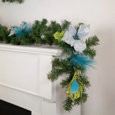 Elegant and beautiful, peacocks are one of the most majestic birds on earth. Add some of that beauty and elegance to your Christmas decor with this pre-decorated garland. Perfect for hanging on doors, over thresholds, or add candles and create a unique table decorationProduct Features:Assorted sized blue and silver ball ornaments and poinsettiasAccented by blue and green glittered poinsettias and peacock feathersLong needle pine and traditional two-tone PVC pine branches Unlit2”- 4″ wide tipsFor indoor use onlyBendable wire center allows for you to shape the garland any way you desireGreen metal hooks on each end for easy hanging Dimensions: 6′ long x 9″ wide Material(s): PVC/plastic/metal/fabric