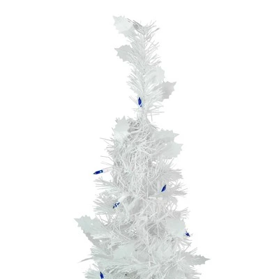 This “pop-up” tree has a collapsible design, which allows it to be set up in seconds. The tree comes pre-strung with blue, incandescent mini lights, making the setup a breeze. Perfect for apartments, dorm rooms, or families who want to relax and enjoy the holiday without the hassle.Product features:Pre-lit with 250 blue lightsBulb size: miniBulb type: incandescent21″ white lead cordWhite inner poleHolly leaf accentsEasy pop-up assemblySlim profile treeAdditional product features:Light sets on tree are UL certified and approved for indoor or outdoor use, however, the tree itself is recommended for indoor use onlyIf one bulb burns out, the rest will stay litLights are equipped with Lamp Lock feature, which makes them replaceable, interchangeable and keep them from falling outComes with replacement bulbs and spare fuseIncludes a white plastic tree standWire gauge: 22120 volts, 60 hertz, 0.51 amps, 61.2 wattsDimensions: 6′ high (from the base of the stand to the top of the tree)22″ base diameter (at the widest point) Material(s): PVC/metal/glass bulbs/wire/plastic