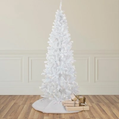 Transform your space into a winter wonderland with the beautiful white Georgian Pine tree. It is a designer-inspired alternative to a traditional green tree with its dazzling white pine needles, sure to reflect the light from the warm white LED lights that it comes adorned with. The lush needles give the tree fullness, but the slim profile makes it ideal for small spaces and allows it to fit perfectly in corners effortlessly.Product Features:Pre-lit with 300 warm white LED lights”Warm white” also known as “warm clear” has a soft natural incandescent glow, similar to candlelightBulb size: mini679 tips2″ wide branch tips5.5′ white lead cordAdditional Product Features:LED lights use 90% less energyDurable non-glass replaceable bulbsCool to the touchPencil profile treeHinged branch construction4-piece easy assembly (including stand)Light sets on tree are UL certified and approved for indoor or outdoor use, however the tree itself is recommended for indoor use onlyIf one bulb burns out, the rest will stay litComes with a replacement bulbs and spare fusesComes with a free black metal tree standWire gauge: 22Dimensions: 7.5′ high (from the base of stand to the top of the tree)36″ base diameter (at the widest point)Material(s): PVC/metal/plastic bulbs/wireNote: Branches are compressed for shipment, and need to be fluffed out upon arrival to look like the photo.
