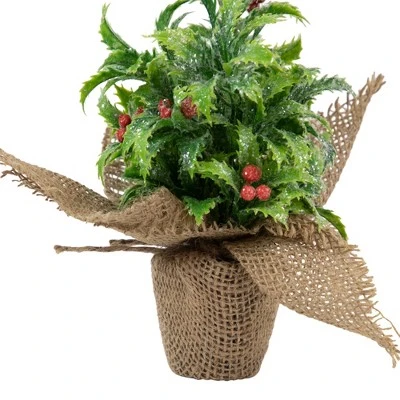 This little holiday plant packs a punch, with its red berries and icy holly leaves. The burlap-wrapped base lends a country feel. Perfect for smaller spaces such as mantles or side tables.Product Features:Mini holiday artificial plantLightly iced glittered leavesRed berriesBurlap wrapped potFor indoor use onlyDimensions: 8″ high x 5 ” in diameterMaterial(s): plastic/burlap