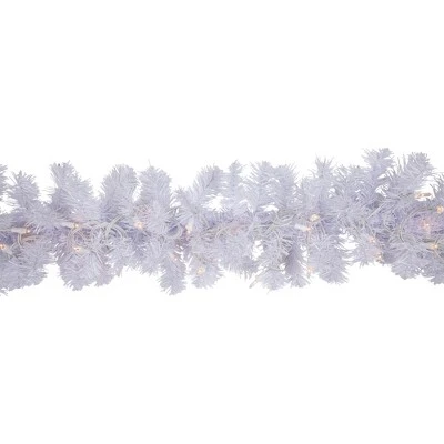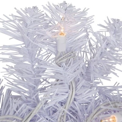 Make your home a holiday paradise this holiday season. It features white needles with 220 tips creating the perfect, lush winter wonderland effect. This gorgeous garland is perfect for your mantle and thresholds. Product Features: Pre-lit with 50 clear lights 220 tips 2″ – 2.5″ wide tips8″ white lead cord Additional Product Features: Light sets on the garland are UL listed for indoor or outdoor use, however, the garland itself is recommended for indoor use If one bulb burns out, the rest will stay lit Lights are equipped with a Lamp Lock feature, which makes them replaceable, interchangeable and keeps them from falling out Contains end-to-end connectors which allow you to connect multiple lighted items (not to exceed 210 watts)Bendable wire center allows you to shape the garland any way you desire Metal hooks on each end for easy hanging Comes with replacement bulbs and spare fusesWire gauge: 22120 volts, 60 hertz, 0.34 amps, 40.8 watts Dimensions: 9′ long x 10″ wide Material(s): PVC/metal/glass/wireNote: Branches are compressed for shipment, and need to be fluffed out upon arrival to look like the photo.
