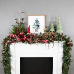 Make your home a country holiday paradise this holiday season. This gorgeous pre-lit mixed pine garland is perfect for your mantle or threshold. A mix of cashmere bottle brush and classic two-tone needles, along with tapered tips, make a bold statement. The realistic design is the perfect finishing touch to your rustic holiday decor.Product Features:Pre-lit with 70 clear lightsBulb size: mini200 tipsBendable wire center allows for you to shape the garland any way you desireMetal hooks on each end for easy hangingAdditional Product Features:UL certified and approved for indoor or outdoor useIf one bulb burns out, the rest will stay litContains end-to-end connectors which allow you to connect multiple garlands together (not to exceed 210 watts)Comes with replacement bulbs and spare fusesWire gauge: 22Dimensions: 9′ long x 12″ wideMaterial(s): PVC/metal/glass bulbs/pine cones/grapevineNote: Branches are compressed for shipment, and need to be fluffed out upon arrival to look like the photo.