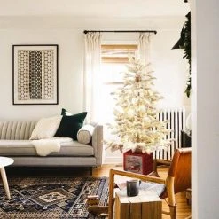LuxenHome 4Ft Pre-Lit LED Artificial Flocked Fir Christmas Tree with Red Wood Square Planter