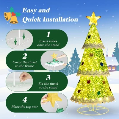 - Hassle-free Assembly: Thanks to the pop-up design, our Christmas tree requires only 4 steps to assemble. You just need to insert the metal tube into the base and connect another metal tube, then hang the tree on the support frame, and finally install the LED wire and the tree top star to complete the installation.