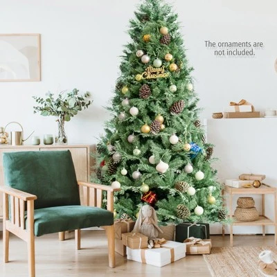 The tall and full-bodied Christmas tree is a good addition for holiday room decoration. Trimmed with classic pine cones, the unlit Christmas tree leaves a large space for you to DIY it with other ornaments prepared by yourself. A well decorated Xmas tree will cheer up people and party atmosphere. Featuring 1651 snow sprayed branch tips, the tree looks as ultra-realistic and lifelike as a natural tree. This Christmas tree will enchant your family and bring joyful festival atmosphere to your home. The 8ft tree is divided into 3 sections to minimize the storage space. And hinged design provides convenience for setup in minutes. Made of new PVC and PE, the tree will work for you for a long time.