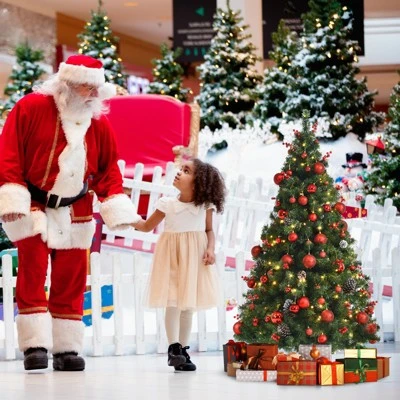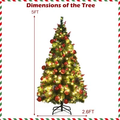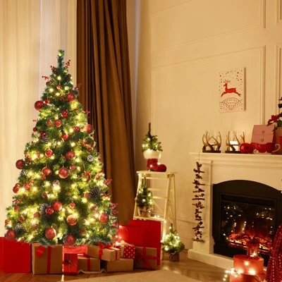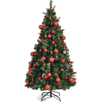 Our 5ft/6ft/7ft dense and lifelike Christmas tree works as a perfect decoration on multiple occasions! The green branch tips that made of premium PVC make the tree look quite lush and lifelike. Pre-strung LED lights are evenly distributed on the Xmas tree and show soft warm white color rather than dazzling white, illuminating your room and creating cozy and harmonious atmosphere. Abundant and various classic Christmas ornaments such as red berries, apples, pine cone and balls are included for you to better decorate the tree. Standing on a cross shaped folding metal base, this tree will stand firmly during Christmas seasons. And 3 divided sections are designed for quick assembly and space-saving storage.